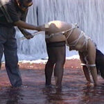 横向きに天井から吊り下げられ電流責めされる人妻が絶叫失神。